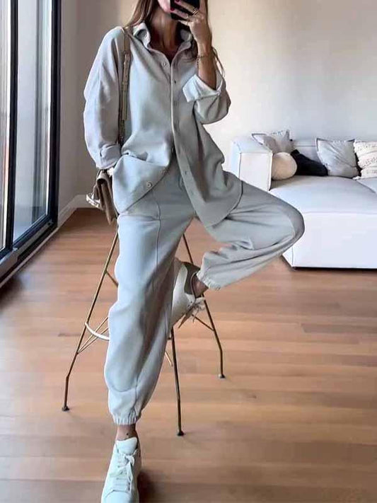 Women's Lapel Single Breasted Shirt Paired with Long Pants Two Piece Suit