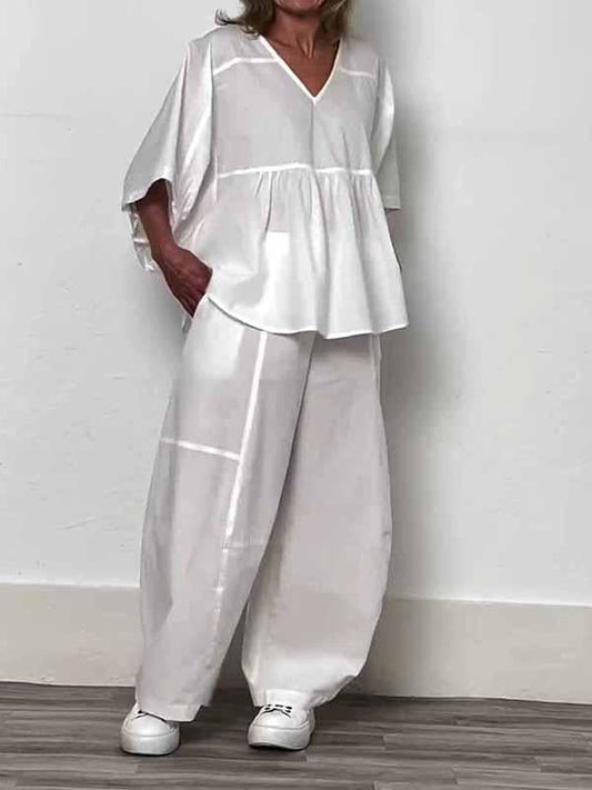 Women's Lapel Solid Color Cotton and Linen Two-piece Suit