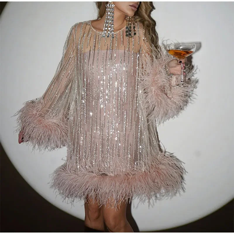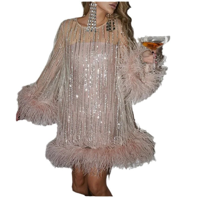 Women's mini dress party sequin plush shiny elegant glitter powder